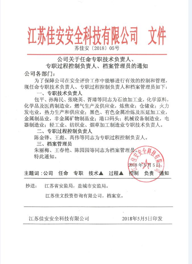 公司關于任命專職技術負責人、過程控制負責人、檔案管理人員的通知
