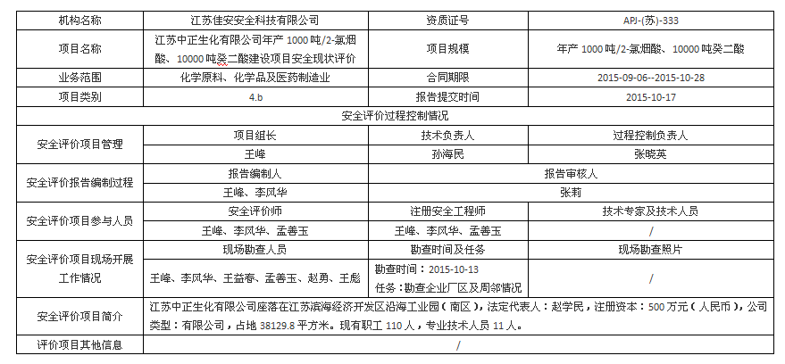 江蘇中正生化有限公司 年產1000噸/2-氯煙酸、10000噸癸二酸建設項目安全現狀評價