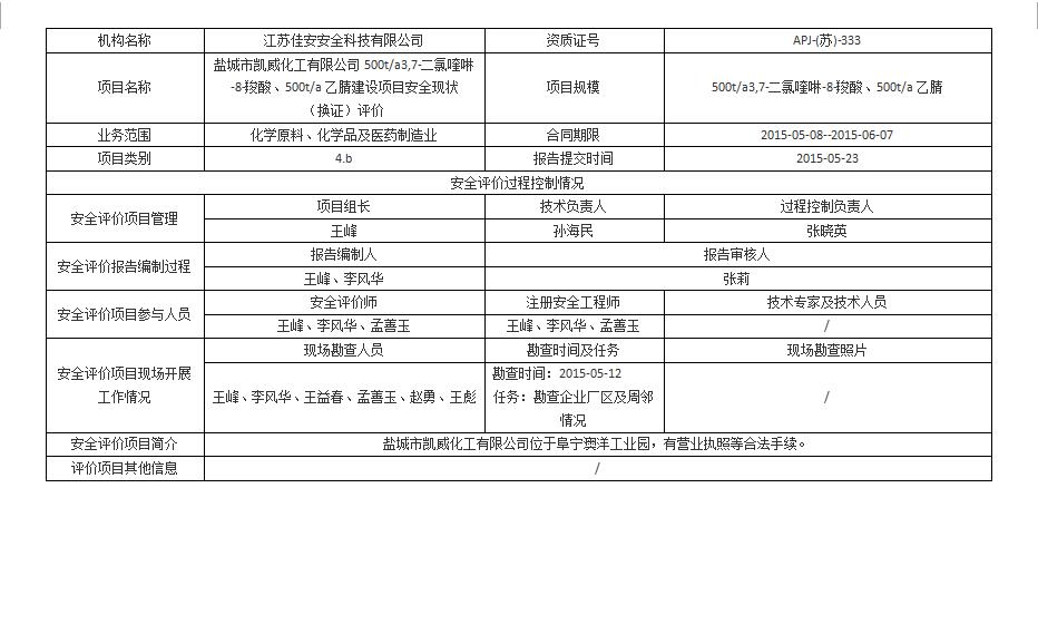鹽城市凱威化工有限公司 500t/a3,7-二氯喹啉-8-羧酸、500t/a乙腈建設項目安全現狀(換證)評價