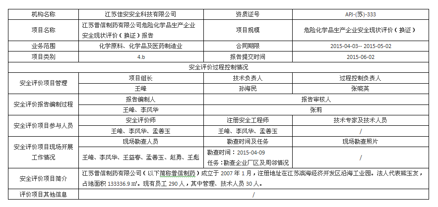 江蘇普信制藥有限公司 危險化學品生產(chǎn)企業(yè)安全現(xiàn)狀評價(換證)報告
