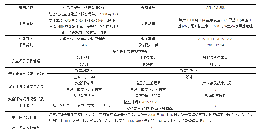 江蘇匯鴻金普化工有限公司 年產(chǎn)1000噸1-(4-氯苯氧基)-3,3-甲基-1-(咪唑-1-基)-2-丁酮(甘寶素)、6