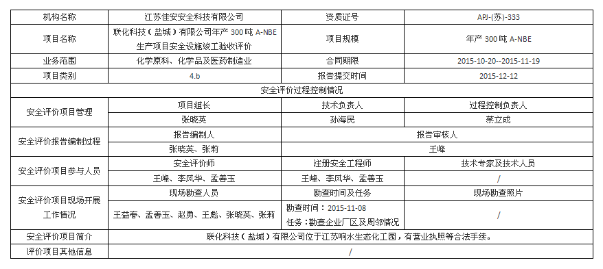 聯(lián)化科技(鹽城)有限公司 年產(chǎn)300噸A-NBE生產(chǎn)項(xiàng)目安全設(shè)施竣工驗(yàn)收評(píng)