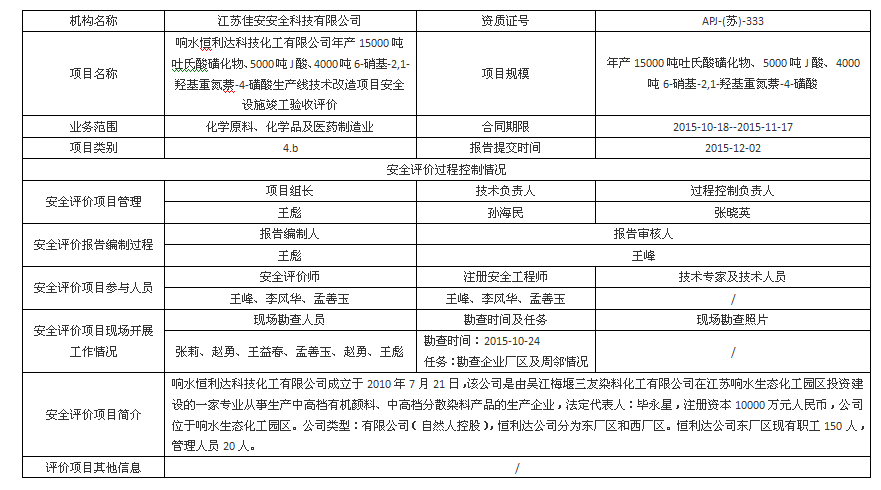 響水恒利達科技化工有限公司 年產15000噸吐氏酸磺化物、5000噸J酸、4000噸6-硝基-2,1-羥基重氮萘-4-磺