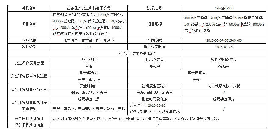 江蘇劍牌農(nóng)業(yè)化工有限公司 1000t/a三唑酮、400t/a三唑醇、50t/a聯(lián)苯三唑醇、50t/a烯效唑、200t/a