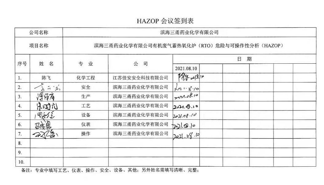 濱海三甬藥業化學有限公司12000Nm3/h有機廢氣蓄熱氧化爐(RTO)危險與可操作性分析(HAZOP)報告